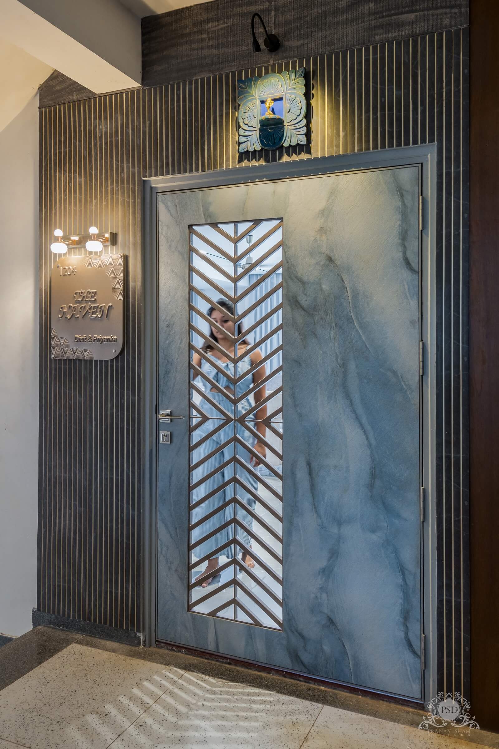 The entrance of the house itself has a hue that is quiet modern i.e. hues of grey and blue that bring a unique visual for the entrance of the house. The name plate is a one which depicts minute details that looks delicate and beautiful. While the main door handle too has been designed by our interior decorators carrying out the same theme in a more wider sense with a bird that looks much interesting. The safety door here has geometrical patterns that blend well with the modern theme of the space.