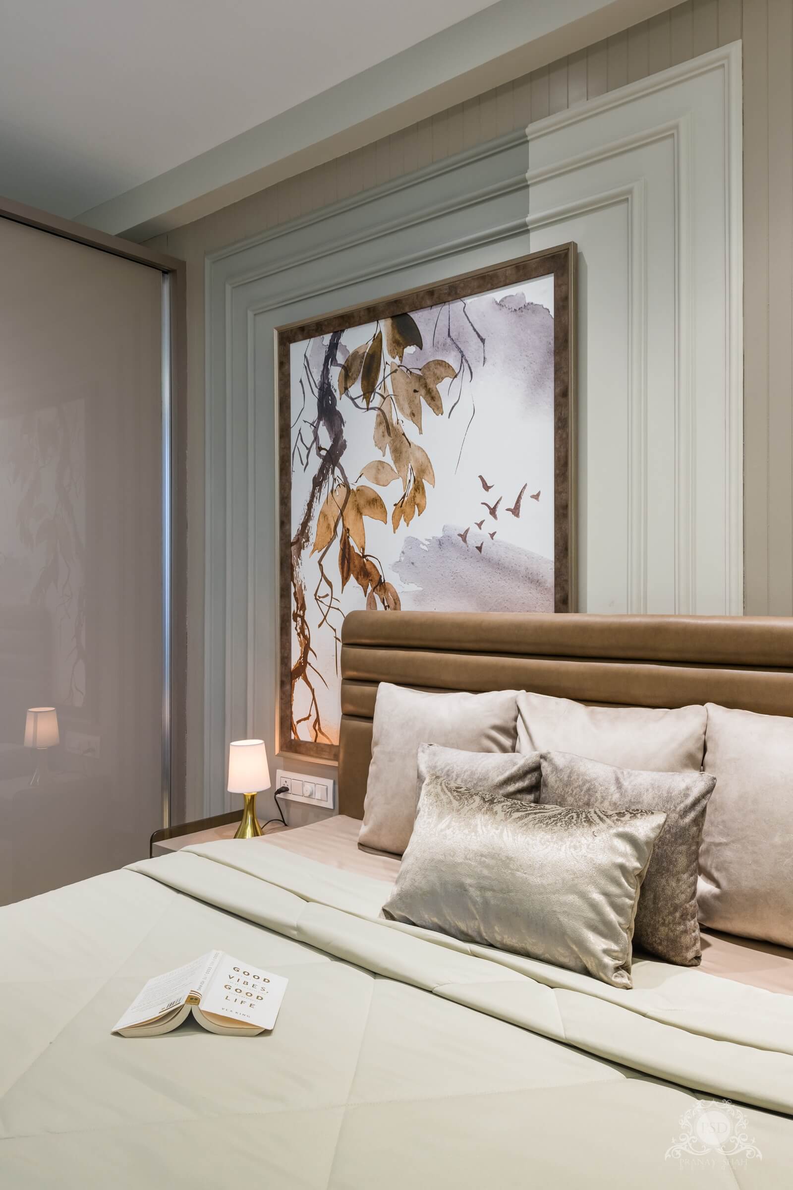 Further the master room is what we talk about that is a concept of a modern royal bedroom. A great color play is done for this room on the wall behind the bed. The wall is designed by our interior designers by creating a huge photo frame kind of form with linear patterns that has a painting of nature customized by our decorators which is the center of attraction of the space. The upholstered bed with a brown tapestry in leather finish seems luxurious and justifies it being the master bedroom. The wardrobe is simply designed in back-painted glass that blends well with the room theme.